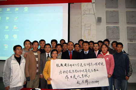 赵厚麟先生的演讲在内容上高屋建瓴,但语言却是朴实幽默,精彩之处常常引起全场掌声,整个演讲过程气氛异常热烈。演讲之后,他与同学们进行了互动交流,并且当场欣然挥毫,为通信学院题写了赠言“祝愿南京邮电大学通信与信息工程学院为中国通信事业和世界通信事业作出更大贡献”。活动的最后,他与在场的同学合影留念。
