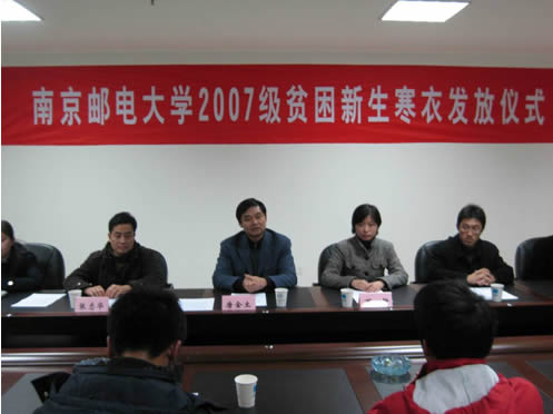 12月26日下午3:30,学生处在仙林校区举行了2007级贫困新生寒衣发放仪式。校党委副书记、副校长唐金土,学生处处长张志华以及部分院(系)的党委(总支)副书记、辅导员、学生代表出席了寒衣发放仪式。仪式由学生处副处长丁静主持。