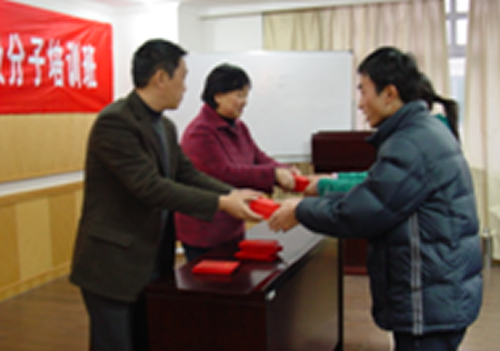 在为入党积极分子培训班学员颁发结业证书