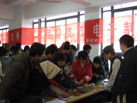 本次比赛面向全校本科生,过程分为大赛宣传、组队报名、参赛选手培训、经验交流、作品制作、作品评比表彰。2007年12月10日报名工作正式开始,共收到四十五组参赛队的报名表,创下历届电子制作大赛报名人数新高。从提交的作品来看,大一的同学虽然还没接触到很多的专业知识,但有很多参赛组通过自学,已经能够用纯数字电路做出八路抢答器,并且达到了题目的指标,有的小组甚至用单片机实现了交通灯;大二的参赛作品已逐渐显示出技术含量,作品主要涉及频率计、音乐播放电路、家庭电子万年历等;大三同学的作品技术含量较高,WSN、串口转USB、无线呼叫等参赛作品无一不展现出参赛队员深厚的专业功底。通过紧张的评比曹赟、蒲天的作品《基于GSM的远程报警智能锁》获得自创意组一等奖;杨俊等同学的作品《LC测量仪》以及曹舒恬等同学的作品《交通灯》(单片机)获得命题组一等奖。