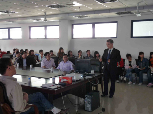 来自新加坡材料研究和工程研究所(IMRE)的陈志宽(CHEN Zhikuan)高级研究员(Senior Scientist)于10月15日访问我校信息材料与纳米技术研究院。IMRE是新加坡科学、技术和研究局(A*STAR)下属的一个研究所,成立于1996年,我校副校长黄维教授曾参与创建该研究所。经过十多年的建设,IMRE已发展成为一个在国际材料科学领域具有较高影响力研究机构。陪同陈志宽博士到访的还有上海市“东方学者”、华东理工大学的陈彧教授。学术报告会在南邮仙林教五413会议室举行,陈志宽博士作了题为“High Performance Organic Semiconductors for Low Cost Electronic”的精彩报告,会议由信息材料与纳米技术研究院副院长凌启淡教授主持。在报告中陈志宽博士详细介绍了其研究小组在有机电致发光材料、有机半导体材料、有机太阳能电池材料等方面取得的突出成果。这些研究成果与我院所开展的研究方向具有高度相关,与会的师生们与陈志宽博士进行了广泛热烈的讨论与交流。
