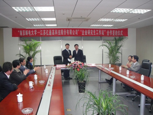 2009年11月7日,我校与江苏亿通高科技股份有限公司关于建立企业研究生工作站的合作框架协议签字仪式在常熟市虞山镇举行。朱洪波副校长和王振洪总经理代表双方在协议上签字。研究生部主任韦玮教授、我校在常熟虞山镇挂职担任副镇长的科技处副处长张登银教授及相关人员出席了签字仪式。
