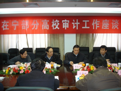 2010年在宁部分高校审计工作座谈会于3月11日下午在我校三牌楼校区第三会议室召开,出席会议的有江苏省教育纪工委书记、纪检组组长蒋吉生、江苏省教育厅审计处处长沈九林、副调研员崔定友等同志及在宁部分省属高校的审计处负责人。座谈会由教育厅审计处处长沈九林主持。