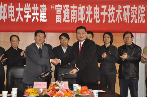 随后,杨震校长与王建沂董事长共同签署了“富通南邮光电子技术研究院”合作协议。根据协议,双方将共同建立信息通信新技术研发及创新人才培养平台,瞄准技术、业务前沿,加强光电子技术、光通信产品等相关领域的研发投入,促进科研成果转化,形成集新业务、新产品的开发研究与人才培养(培训)、技术服务、产品评测和前沿课题研究于一体的、能为富通集团有限公司创新发展提供支撑的研究平台。