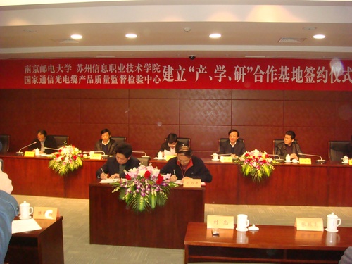 4月16日下午,我校与吴江市国家通信光电缆产品质量监督检验中心在吴江大厦会议中心共同举行产学研合作基地签约仪式。江苏省吴江市副市长汤卫明、苏州市质量技术监督局副局长曹明华、吴江市质量技术监督局局长黄依群,我校副校长刘陈出席签约仪式。签约仪式由吴江市政府秘书长张建国主持。