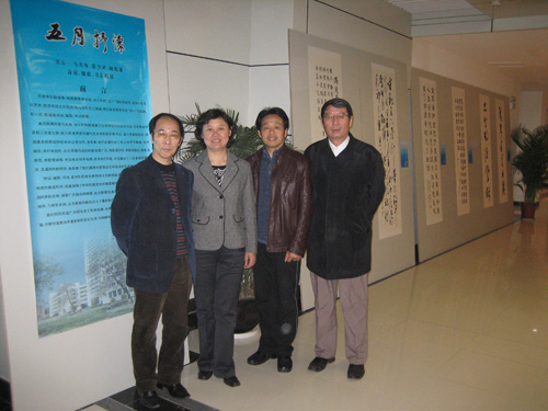 丹青华彩歌盛事,翰墨飘香诵和谐。为了庆祝“五一”国际劳动节,宏扬中华文化艺术,营造校园文化氛围,陶冶师生员工情操,校工会举办了《五月抒怀——庆“五一”马名骞、张少武、颜福康诗词、楹联、书法联展》。这次联展的是马名骞、张少武和颜福康三位老师创作的部分作品,共有三十五幅。此次所展作品的内容涉猎广泛,有揽景抒怀、有寄语铭志、有生活感悟、有哲理诠释;书法也未假手名师,全系自己手笔。不仅展示了三位老师热爱生活、灵通自然的情怀,也反映了他们颇高的思想品位和较深的艺术造诣。
