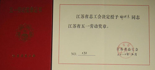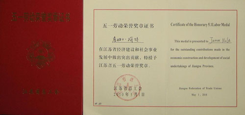 经学校推荐、江苏省总工会批准,我校谢继东、James.Nolt老师分别荣获江苏省“五一”劳动奖章和江苏省“五一”劳动荣誉奖章。