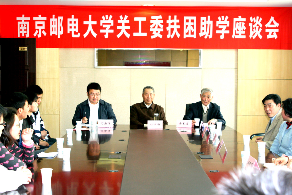 4月29日下午,我校关心下一代工作委员会、校学生处在仙林校区共同举办了2010年扶困助学座谈会。校关工委副主任桂立海、蒋长发、秘书长李其芳、副秘书长孔宪禹及成员习学娟、高凤英、汪晓丽老师、学生处副处长何海洋出席了会议,十五位受助同学参加了座谈会。会议由学生处学生资助管理科科长黄建龙老师主持。
