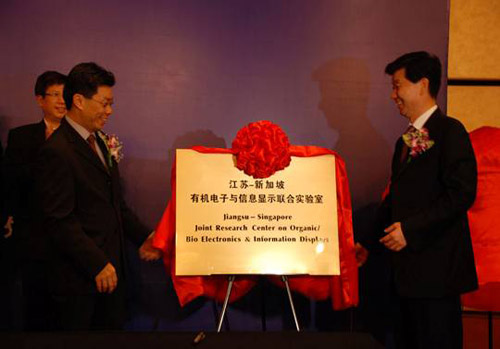 江苏省人民政府副省长、理事会江苏方副主席张卫国和新加坡贸工部兼人力部政务部长、理事会新方副主席李奕贤先生出席大会并分别致辞。开幕式上,李奕贤部长与张卫国副省长共同为“江苏-新加坡有机电子和信息显示联合实验室”揭牌。“江苏-新加坡有机电子和信息显示联合实验室”是由中方(我校“江苏省有机电子与信息显示重点实验室—省部共建重点实验室培育基地”)和与新方(新加坡国立大学、南洋理工大学、分子与细胞生物学研究院、新加坡材料研究院、新加坡数据存储研究院等)共同牵头的合作机构。据悉,联合实验室的宗旨是以建设信息科技强省为目标,有效整合江苏省与新加坡双方的优势科技资源,建立共享机制,构建一个开放、共享、功能完善、条件一流的有机电子科技创新平台,为提升我省信息技术自主创新能力、科技成果转化和应用、技术推广与服务能力创造条件和提供服务。拟开展的主要合作工作将侧重于有机发光二极管显示、有机信息传感、有机光伏太阳能电池、有机存储器等领域展开科研合作项目与技术交流并,定期进行科学技术人才与管理人才的交流互换,定期举办双边科技合作会议汇报合作进展与后续合作计划等。此次联合实验室的顺利揭幕将为中新的深入合作开启了新的航程。
