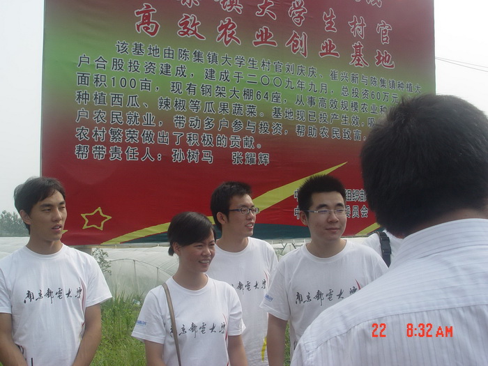 7月22日上午,暑期科技服务团参观了盐城市阜宁县陈集镇大学生村官创业基地。大学生村官、阜宁县陈集镇镇长助理、南京邮电大学2007届毕业生刘庆庆带领服务团深入了解陈集镇的创业史并带领我们参观了基地。通过参观和考察,让服务团成员感受了新时期大学生“村官”勇于开拓、敢于创新的可贵精神,纷纷表示要向他们学习,把自己学到的知识同社会的需求紧密地结合在一起,敢于吃苦、勇于开拓、乐于创新,实现人生价值与社会价值的完美统一。