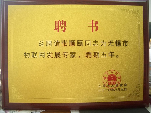 无锡市政府所发的“无锡市物联网发展专家”聘书