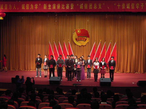 团支部、团小组响应校团委号召,分别召开“诚信人生、诚信支部”主题生活会,团支部与每位学生签订《诚信考试承诺书》, 开展“诚信宣誓”活动,为即将到来的考试交上一份真实、满意的答卷。学校开展了“拒绝作弊,诚信迎考”、“ 讲诚信、重践行、树新风”、“诚实守信,快乐人生”横幅签名、按手印活动,表明学生诚信为人的决心。此外,紫金辩论社和演讲与口才协会组织开展了一次以诚信为主题的辩论赛,通过“善意的谎言与诚信”之间的辩论,让学生对自身言行有更深入地思考。11月17日晚,“诚信为人,诚信为学”新生演讲比赛暨“诚信团总支”、“十佳诚信学子”表彰大会在大学生活动中心青春剧场隆重举行。经济与管理学院祈丹丹同学凭借稳练的台风和优秀的演讲技巧荣获比赛一等奖。校团委书记张翼为获奖选手及各院诚信团总支代表、十佳诚信学子颁奖。