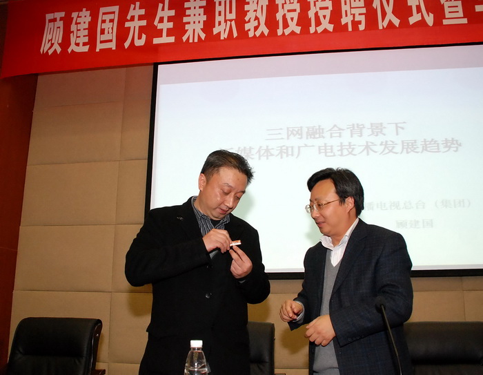 在受聘仪式上,刘陈副校长为顾建国先生颁发了了聘书、佩戴南京邮电大学校徽,并向顾建国先生表示感谢和祝贺。刘校长还表示,随着广播电视网的进一步发展,顾教授的加入一定会为南邮的通信学科发展带来重要的意义。