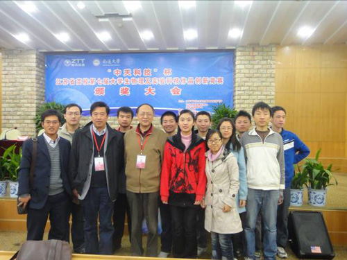2010年11月26~28日,由江苏省教育厅和物理学会主办、南通大学承办的“中天科技杯”江苏省高校大学生第七届物理及实验科技作品创新竞赛决赛在南通举行。我校在校级竞赛和省预赛的基础上有8件作品参赛,经过两天论文答辩及制作作品展示问辩,我校朱翀、张堪和张静娴同学的科技作品《基于GSM网络的短消息验证超市存包柜》获得特等奖,余瀚光、翁智勋和张泽华同学的科技作品《基于半导体制冷的气体冷却装置》获一等奖,另外获二等奖4项,优秀奖2项,李诚元老师、田友伟老师被评为“优秀指导老师”,我校获优秀组织奖。