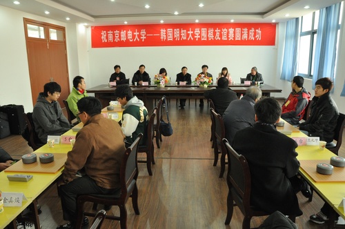 2011年1月4日上午,南京邮电大学仙林校区体育部会议室举行了南京邮电大学——韩国明知大学围棋友谊赛。比赛开始前,南京邮电大学副校长朱永平教授代表学校对韩国明知大学师生的到来表示热烈的欢迎,并向韩方师生介绍了我校的基本情况及发展规划。金真焕教授对我校的热情接待表示诚挚的感谢并邀请南京邮电大学有机会派代表到明知大学参观访问。 中午,金真焕教授面向我校热爱围棋的学生作了一场围棋知识讲座。下午四点比赛圆满结束。 韩国明知大学是韩国一所知名综合性大学,这次的围棋友谊比赛将为两校开展合作交流打下基础。