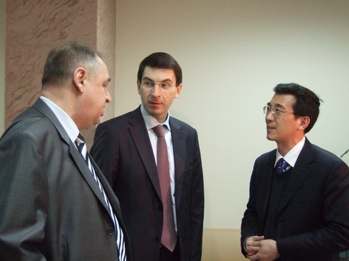 俄罗斯国家电信部部长Igor Olegovitch Zhegohev(左二)、莫斯科通信与信息技术大学Adzhmov校长(左一)和杨校长交流