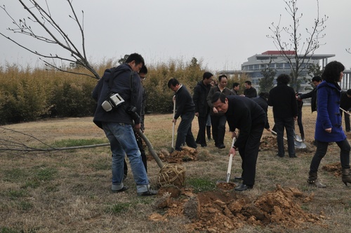 植树现场分工明确、秩序井然、热火朝天,近百名老师或掘坑,或培土,或浇水,忙得不亦乐乎。经过半个多小时的辛勤劳动,30余株含苞待放的紫玉兰在春风中傲然挺立了起来,在仙林这片新鲜、充满活力、充满希望的土地上开始了它们茁壮成长之路。