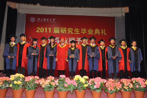 研究生院(筹)副院长吴蒙教授主持学位授予仪式。校长杨震为博士学位获得者颁发博士学位证书并合影留念。校长杨震,副校长朱永平、黄维、刘陈、朱洪波、颜晓红为2011届硕士研究生颁发硕士学位证书并合影留念。会场气氛庄重热烈,毕业生的喜悦与感恩、老师的嘱托与鼓励交织在一起,感染着在场的每一个人。