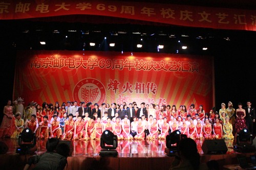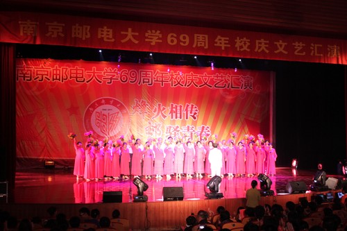 晚会现场南邮学子们高举着“南邮生日快乐”、“南邮,我爱你”、“我与母校共成长”、“我与母校共奋进”等标语,表达对母校生日祝福。整台晚会生动地再现了我校从创校之初到如今的光辉历程,表达了南邮人对母校无限的爱。