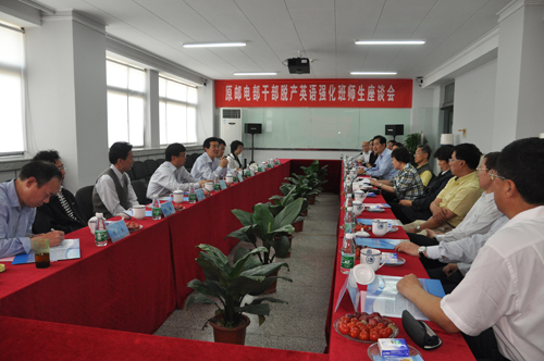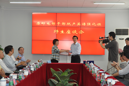 2011年4月30日上午,在南京邮电大学教学主楼7楼会议室,校长杨震、副校长朱洪波等与原邮电部干部脱产英语强化班师生共聚一堂,共叙师生情、校友情、离别情,气氛热烈温馨。座谈会由强化班学员、江苏省通信管理局巡视员许二宁主持。