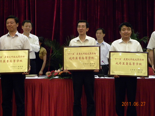 大会对在“十一五”期间科技创新工作成绩显著的高校进行了表彰。我校因“十一五”期间科技创新工作成绩显著,被江苏省人民政府授予“‘十一五’获重大科技成果奖励成绩显著高等学校”荣誉称号。李学勇省长为获奖高校颁发奖牌,我校杨震校长代表学校领奖,朱洪波副校长参加了大会。