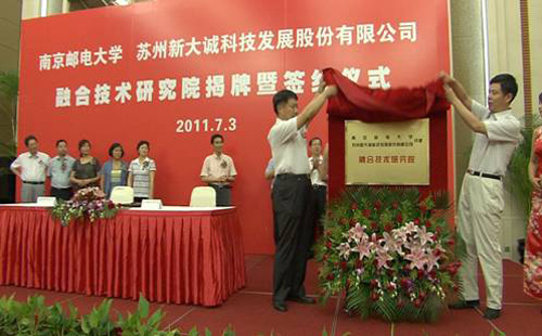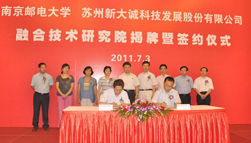 为了加快推动三网融合、物联网等新一代信息技术产业的研发、示范应用和产业化,南京邮电大学物联网科技园与苏州新大诚科技发展股份有限公司联合共建的融合技术研究院揭牌暨签约仪式于7月3日在苏州金陵观园国际酒店隆重举行。江苏南邮物联网科技园有限公司董事长、南京邮电大学副校长朱洪波教授、苏州新大诚科技发展股份有限公司董事长陈磊以及双方董事和管理团队出席签约仪式,参加签约活动的还有苏州市科技局副局长陶冠红、苏州市经济和信息化委员会电子信息产业处处长杨非、苏州工业园区科技局副局长许文清等地方政府领导。
