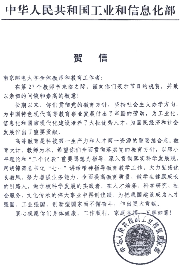 9月7日,在第27个教师节来临之际,中华人民共和国工业和信息化部向我校发来贺信,向我校全体教师和教育工作者表示节日的祝贺!贺信全文如下: