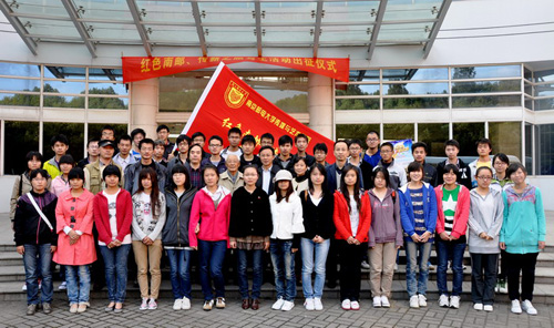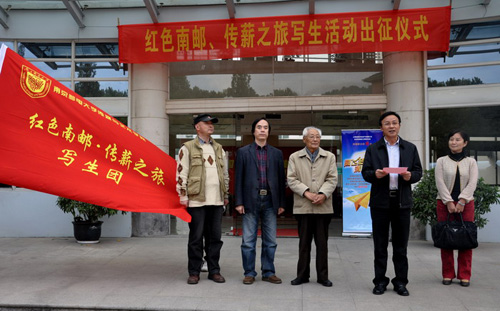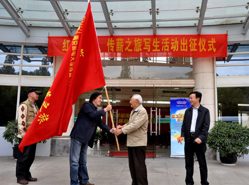在师生们热烈的掌声中,王平院长从南京邮电学院原党委书记、99岁高龄的老红军秦华礼同志手中接过了红色的团旗。写生团肩负着南邮3万名师生的殷切期望,即将踏上光辉的“红色南邮•传薪之旅”。