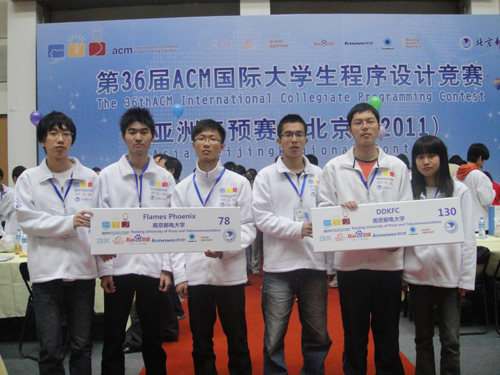 2011年10月21日-23日,第36届ACM国际大学生程序设计竞赛(简称ACM/ICPC)亚洲区预选赛(北京赛区)现场赛在北京邮电大学举行,我校参赛的2支代表队全部获奖。其中由计算机学院/软件学院陈志老师担任教练,自动化学院2008级本科生蔡文举、理学院2009级本科生康阳阳、通信与信息工程学院2009级本科生刘舸等同学组成的Flames Phoenix代表队荣获银奖,这是我校2009年参赛以来首次获得该项赛事的银奖;计算机学院/软件学院2009级本科生杨萌、海外教育学院2009级本科生丁燚、计算机学院/软件学院2009级本科生平丹等同学组成的DDKFC代表队荣获铜奖。