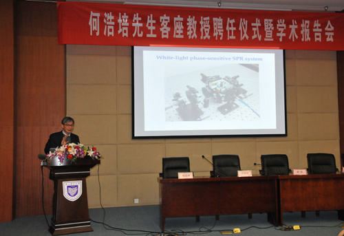 受聘仪式后,何教授为师生们作了《表面等离子体波传感技术》的学术报告。何教授首先简单介绍了表面等离子体波的基本概念以及如何激发表面等离子体波,然后着重介绍了如何利用表面等离子体波进行生物传感检测,并通过数据与分析证明了表面等离子传感技术相比于其他技术具有灵敏度高、不破坏待测溶液、可实时测量等优点,而何教授本人所研究的通过测量光学相位的方法进行检测进一步提高了表面等离子体波传感的检测灵敏度,该技术在生物医疗行业有广阔的应用前景。最后何教授对该技术的未来发展作了展望。