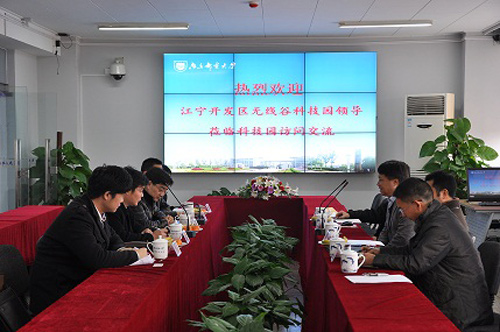 陈开庆董事长介绍了江宁开发区无线谷的整体规划与工作进展,并表达了与我校合作建设跨园区的产业研究院和科技园的意向。无线谷科技园是以拟建设的南京通信技术国家实验室为中心,汇集无线通信高端人才、研发中心和相关企业,打造无线通信技术研发和生产企业集聚的无线通信产业基地。
