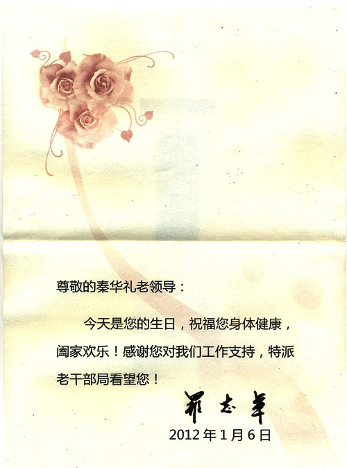 江苏省委书记罗志军祝福秦老的生日贺卡