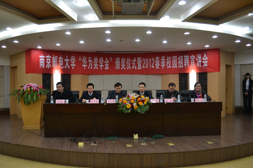 近日,“华为奖学金”颁奖仪式暨华为公司2012春季校园招聘宣讲会在我校三牌楼校区隆重举行,华为技术有限公司南研所人力资源部秦刚部长、华为技术有限公司销售与服务体系中东地区部人力资源部欧雪勇主管、华为技术有限公司南研所人力资源部任华经理、我校朱永平副校长及学生工作处相关负责人参加了颁奖仪式并向获奖学生颁奖。