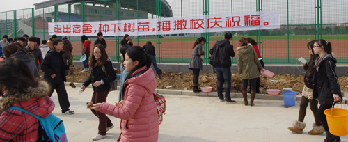3月12日,我校青年志愿者联合会在仙林校区新运动场外开展了主题为“志愿植树迎校庆,我为南邮添新绿”的植树活动。 此次志愿植树活动不仅吸引了众多校庆志愿者的积极参与,也得到了校团委老师及辅导员老师的大力支持与参与,大家铲土浇水,种下一棵棵希望的树苗,并将亲手写下的祝福卡片挂在树苗上,用实际行动为校庆70周年献礼。