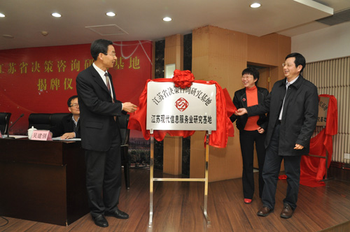 3月16日上午,我校两个江苏省决策咨询研究基地(“江苏农业信息化研究基地”和“江苏现代信息服务业研究基地”)揭牌仪式在三牌楼校区科学会堂一楼演讲厅隆重举行。江苏省社科联党组书记张颢瀚,“江苏农业信息化研究基地”校外首席专家许二宁、吴建强,“江苏现代信息服务业研究基地”校外首席专家胡学同,副校长叶美兰等领导和专家出席仪式,共同为两个研究基地揭牌。仪式由副校长叶美兰主持。