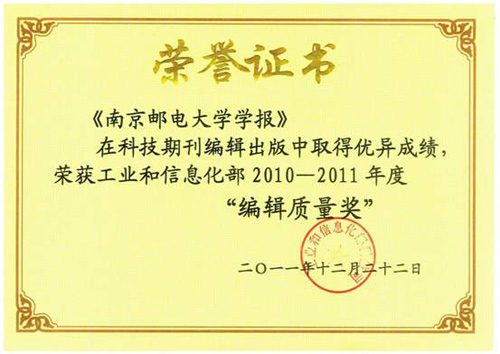 近日,接工业和信息化部科技司“关于工业与信息化部科技期刊(邮电类)评比结果的通知”(工信科简函(2011)571号),《南京邮电大学学报(自科版)》荣获工业和信息化部“编辑质量奖”。邮电高校仅两家学报获奖。
