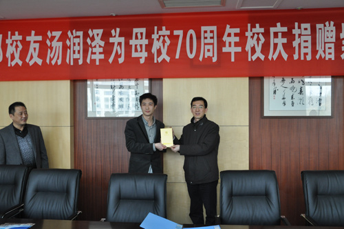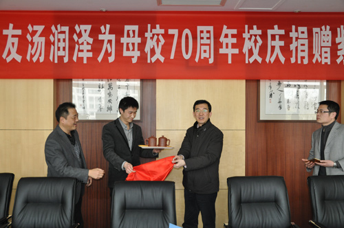 近日,我校2007级校友、宜兴紫砂艺术界著名陶艺世家徐门紫砂艺术第6代传人汤润泽向母校校庆捐赠了300只精品紫砂茶杯。校长杨震出席捐赠仪式并向汤润泽颁发了捐赠证书。杨校长高度赞扬了汤润泽校友的捐助行为,认为汤润泽此举不仅是感恩母校教育的行为,也为其他校友树立了典范。