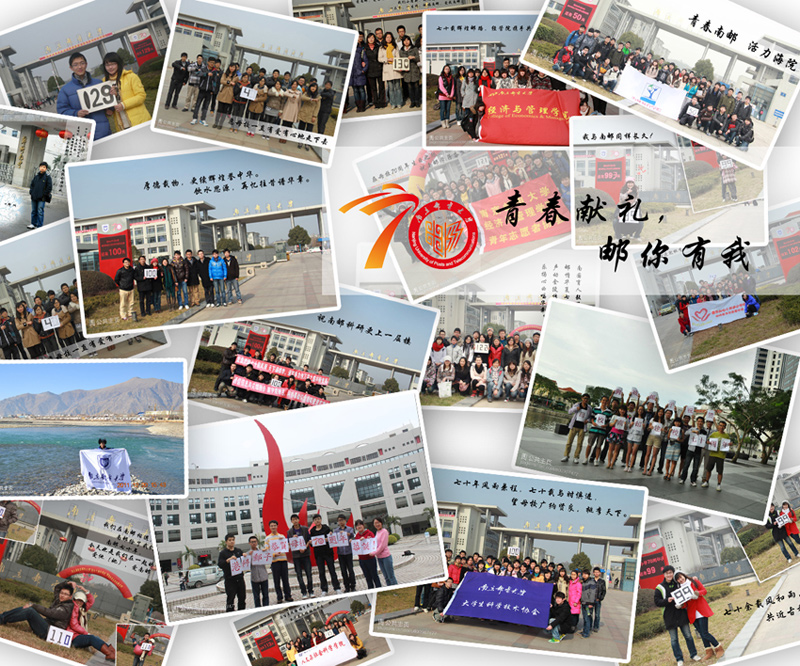 “青春献礼,邮你有我”主题街拍分为男生篇,女生篇,情侣篇,团队篇,城市篇以及海外篇,由参与者举着自行设计的校庆倒计时牌,自由拍摄后用图片处理软件将照片与祝福校庆的话语结合起来,再通过校团委人人网公共主页“青春南邮”(http://page.renren.com/600907477)以及新浪微博“南京邮电大学团委”(http://weibo.com/nuptyouth)展示出来,在校园内外营造了浓浓的邮子情。