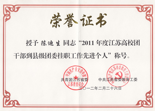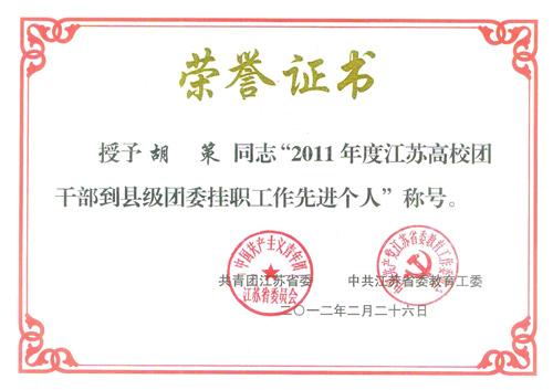 会议对2011年高校团干部的挂职工作进行了总结,团省委、省委教育工委对2011年度江苏高校团干部到县级团委挂职工作的先进集体和先进个人进行了表彰。我校陈迪生、胡策两位同志被授予“2011年度江苏高校团干部到县级团委挂职工作先进个人”称号。