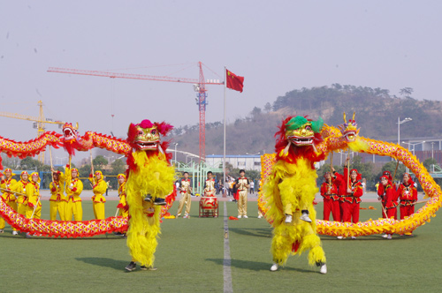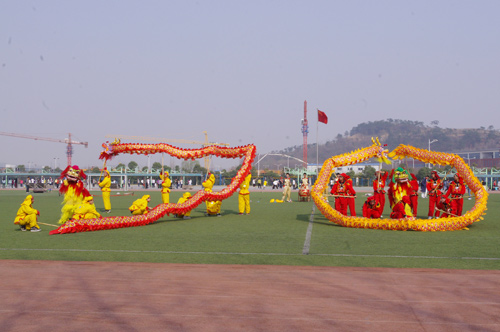 伴随着磅礴的音乐和密集的锣鼓声,赤金双龙在队员的娴熟舞动下,时而盘旋聚首,时而相互缠绕,时而飞速游走,时而卧底潜行,各种造型层出不穷,活灵活现,将龙的精气神韵展露无遗。待双龙昂首示意,两头北狮欢腾雀跃,勇跃登场,翻滚、扑跌、跳跃、登高,姿态百异,威武勇猛,惟妙惟肖,最后龙狮共舞,组合成“70”图案,气势恢宏,精美绝伦,博得检阅队伍的一阵阵喝彩,使整个操场都沉浸在喜庆祥和的气氛之中。