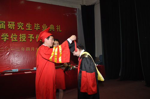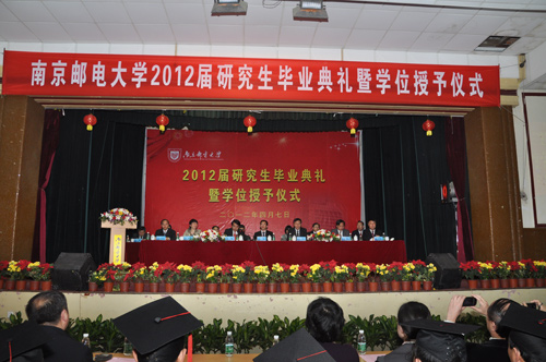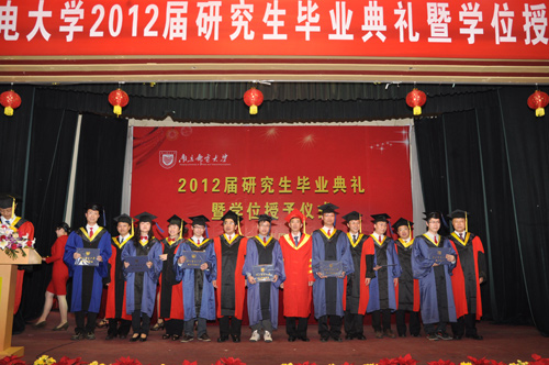 在激昂的音乐声中,校长杨震为2012届博士学位获得者颁发博士学位证书并合影留念。校长杨震,副校长朱永平、黄维、刘陈、叶美兰、朱洪波、颜晓红为2012届硕士学位获得者颁发硕士学位证书并合影留念。研究生院(筹)副院长吴蒙主持学位授予仪式。