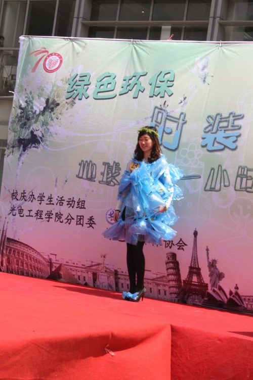 为宣传绿色校庆,环保生活的理念,光电工程学院分团委学生会和“绿色风”环保协会又在南二广场联合举办了“绿色校庆——环保时装秀”活动,共有来自全校14个学院的18名选手参加了比赛。选手们凭借精妙的构思和设计,利用废旧报纸、废光盘和一些废弃的物品,制作了各式各样的环保时装。时装秀上,选手们不仅充分展示着自我,宣传了低碳环保理念,还以另一种方式为校庆70周年献礼。