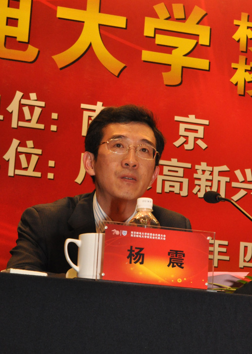 杨震校长在大会上作了热情洋溢的讲话。他总结了校友会成立以来的工作情况,深情回顾了众多领导、企业和校友在学校校园建设、学生资助、科技项目研究、实验室共建等各个方面给予南邮的无私帮助和支持。目前,南京邮电大学在全国已成立了30个校友分会,在纽约成立了北美校友会。各地校友分会广泛凝聚本地校友力量,为母校的发展以及当地社会经济建设和通信事业的发展做出了卓越贡献。在校庆筹备过程中,在各校友分会的积极组织下,各地校友纷纷组织校友聚会、拍摄祝福视频、发送祝福短信,捐赠礼品等,以各种方式喜迎母校70华诞,学校还将不断深化校友会各项工作,通过内容与形式的创新,推动校友会工作再上新台阶。