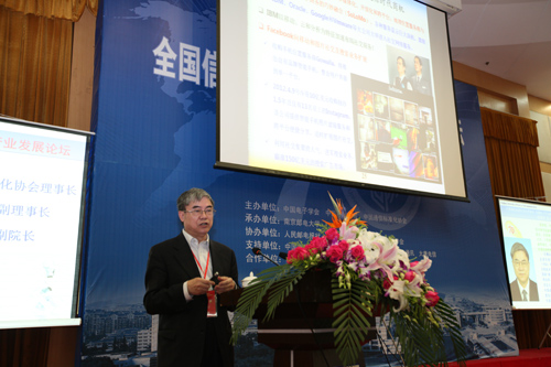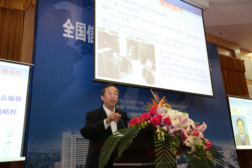 在开幕式后举行了大会特邀报告上,赵厚麟副秘书长、靳东滨副总工程师、邬贺铨院士、周建明总经理、武锁宁总编辑先后带来了“世界电信发展趋势和ITU”、“中国电信转型与创新发展实践”、“ICT产业变革的启示”、“移动互联网的现在和未来”、“高屋建瓴 系统推进——关于推进‘新一代信息技术产业发展’的思考”等有关信息技术与战略性新兴产业的前沿报告。大会特邀报告由中国电子学会副理事长兼秘书长刘汝林主持。