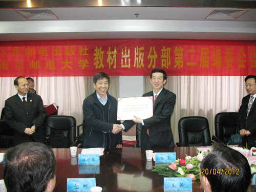 人民邮电出版社徐修存书记宣读了人民邮电出版社南京邮电大学教材出版分部第二届编委会委员名单,徐书记向主任委员杨震校长、副主任委员颜晓红副校长颁发了聘书。杨震校长为第二届编委会委员颁发了聘书。