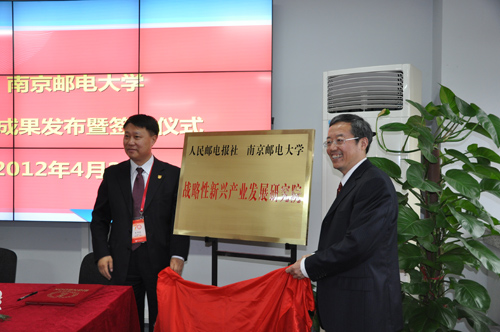近日,由人民邮电报社和我校共同发起的“战略性新兴产业发展研究院”正式成立并举行了揭牌仪式,武锁宁总编辑和朱洪波副校长在我校物联网科技园分别代表人民邮电报社和南京邮电大学为双方合作建立的“战略性新兴产业发展研究院”揭牌。