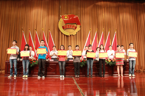 校团委张翼书记宣读了《关于表彰2011/2012学年五四红旗团支部、先进团支部、优秀团员标兵、优秀团员的决定》,授予B100110等43个团支部“五四红旗团支部”荣誉称号,授予B090204等159个团支部“先进团支部”荣誉称号,授予孙蓉等84名同学“优秀团员标兵”荣誉称号,授予周天同等771名同学“优秀团员”荣誉称号。朱永平副校长等领导分别为“优秀团员标兵”代表、“五四红旗团支部”代表颁奖。