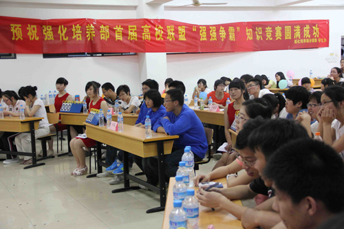 5月11日晚,强化培养部在教3-410组织了首届仙林高校联盟“强强争霸”知识竞赛。比赛是在仙林高校联盟建立的大背景下举办的,旨在推动仙林高校联盟内包括南京大学、南京师范大学、南京中医药大学、南京财经大学、南京邮电大学等多所高校强化学院(班)学生的沟通与交流,为大家搭建一个展现博学风采、互相学习的平台。本次比赛以“博知齐享,大爱共建”为主题,由我校强化培养部分团委、学生会主办。5所学校强化班的学生组成了5个代表队一同参加了比赛。