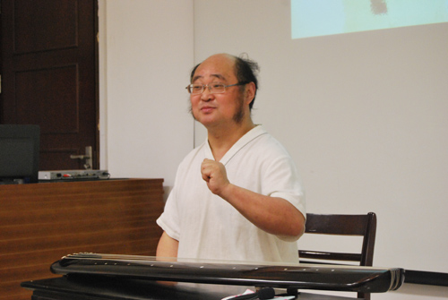 马杰首先对古琴作了介绍,古琴形态修长优美,方正雅致,长约三尺六寸五,象征一年三百六十五天。琴底扁平,琴面弧形凸起,分别象征天地。接着具体而详细的分析了自己对古琴的看法,他指出,古琴是中国传统文化的精髓,中国的许多典故如“高山流水”等都与古琴息息相关,古琴的历史即是一部中国音乐史与一部中国文化史。