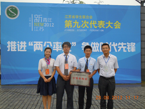 江苏省学生联合会第九次代表大会于8月28日在宁开幕。来自全省普通高等学校和中等学校学生会、高等学校和科研教育机构研究生会的435名代表参加大会。我校学生会当选为江苏省学联第九届委员会成员,并荣获“江苏省本科院校十佳学生会”称号。我校大学生科学技术协会、心理健康协会、漫漫邮子路协会、858街舞社获得“江苏省百佳社团”称号。